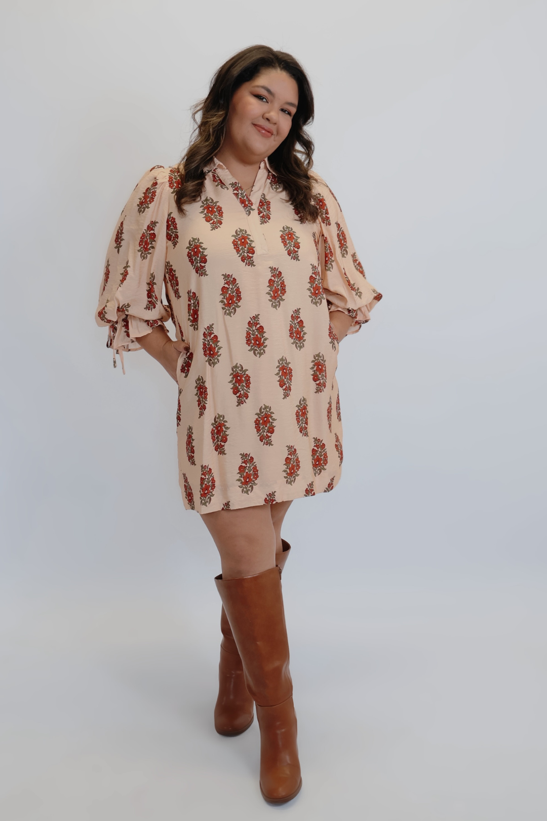 Fresh and feminine, the Blush Bloom Mini Dress is your go-to piece for easy elegance. Designed with a charming floral print, this lightweight woven dress features puff sleeves with drawstring tie cuffs and a flattering back waist tie for a softly defined silhouette. The collared split neckline adds a polished touch, while hidden side pockets keep it practical and comfortable for everyday wear.