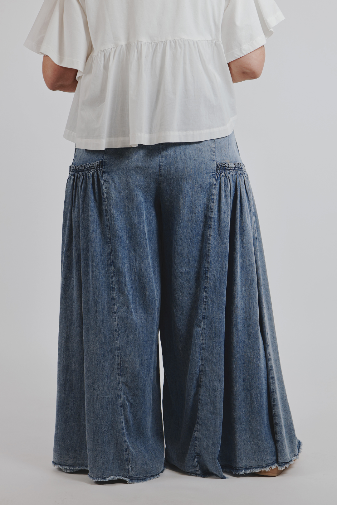 Meet the soft, flowy pair your wardrobe has been waiting for — the Dreamy Chambray Palazzo Pants. Crafted from lightweight 100% Tencel chambray, these wide-leg beauties offer an airy, ultra-comfortable fit that moves with you. The elastic waistband keeps things effortless, while the ruffled side panel details add the sweetest touch of boho charm.