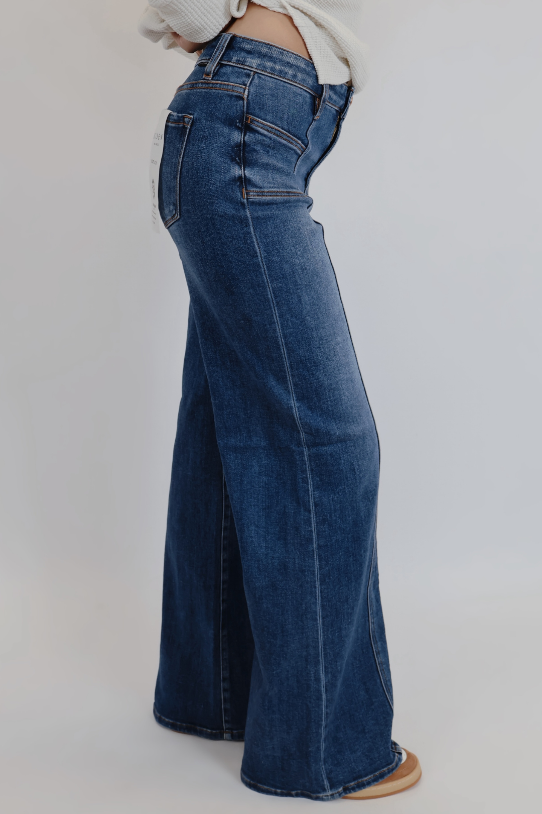 Turn heads in our Mid Rise Wide Jeans, crafted for the modern woman who loves a timeless silhouette with a touch of edge. These jeans feature a flattering mid-rise waist and a bold wide-leg cut that flows with every step. The standout detail? Chic front patch pockets that add a subtle utilitarian flair while enhancing the tailored structure.