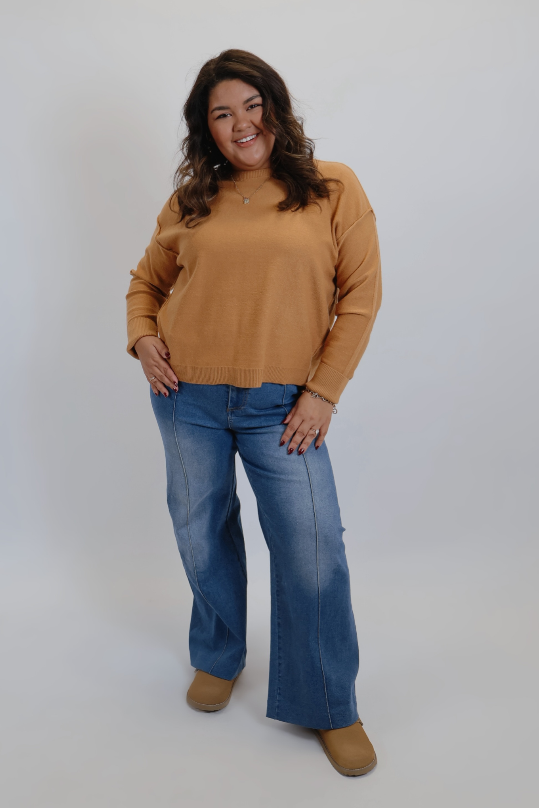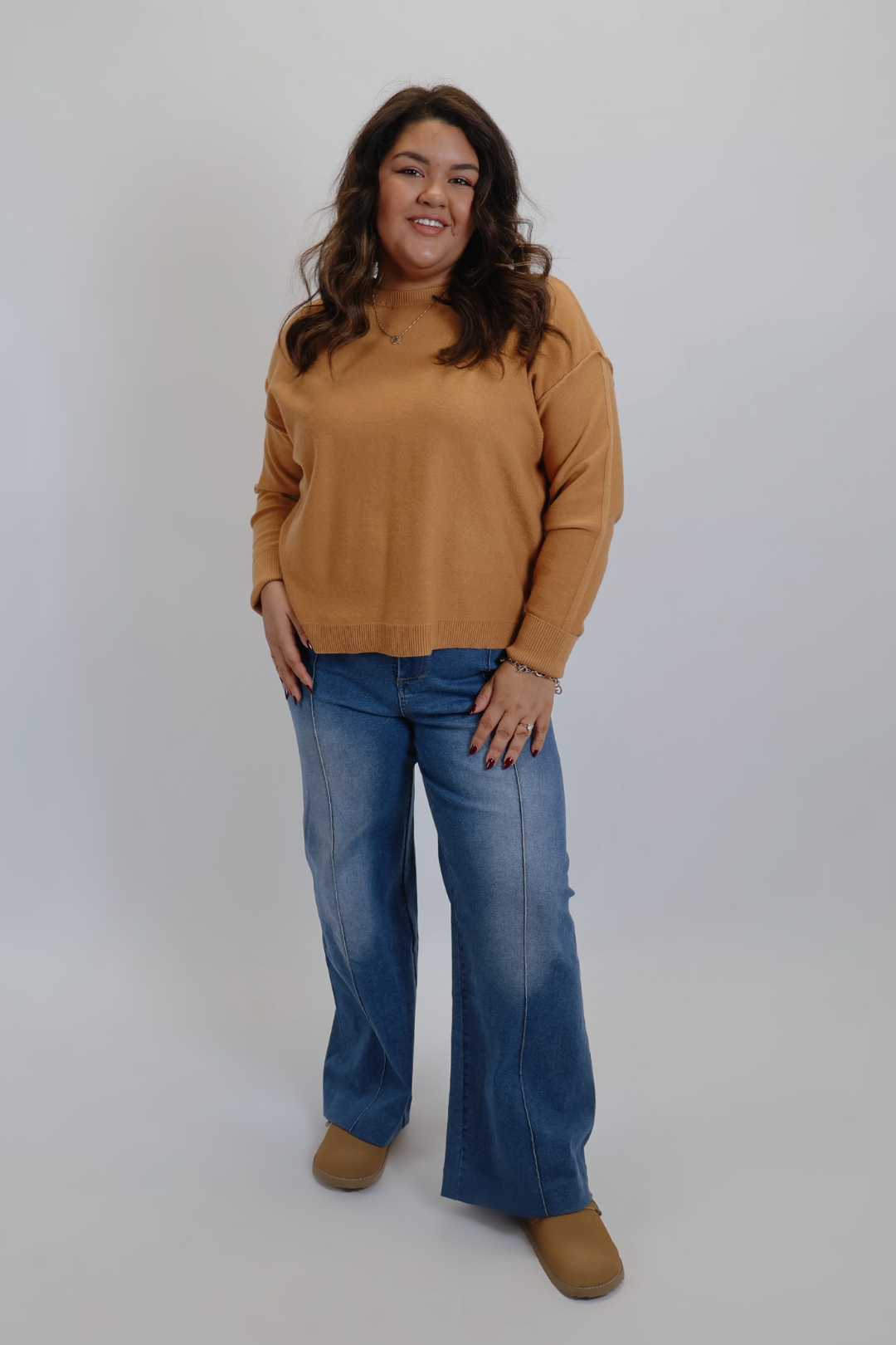Embrace cozy comfort with the Fireside Favorite Sweater. This soft knit pullover features a relaxed, boxy silhouette with dropped shoulders, long sleeves, and exposed seam detailing that adds a casual edge. Finished with ribbed trim at the crew neckline, cuffs, and hem — plus subtle side slits and a flattering high-low design — this sweater is the perfect effortlessly laid-back piece for everyday wear.