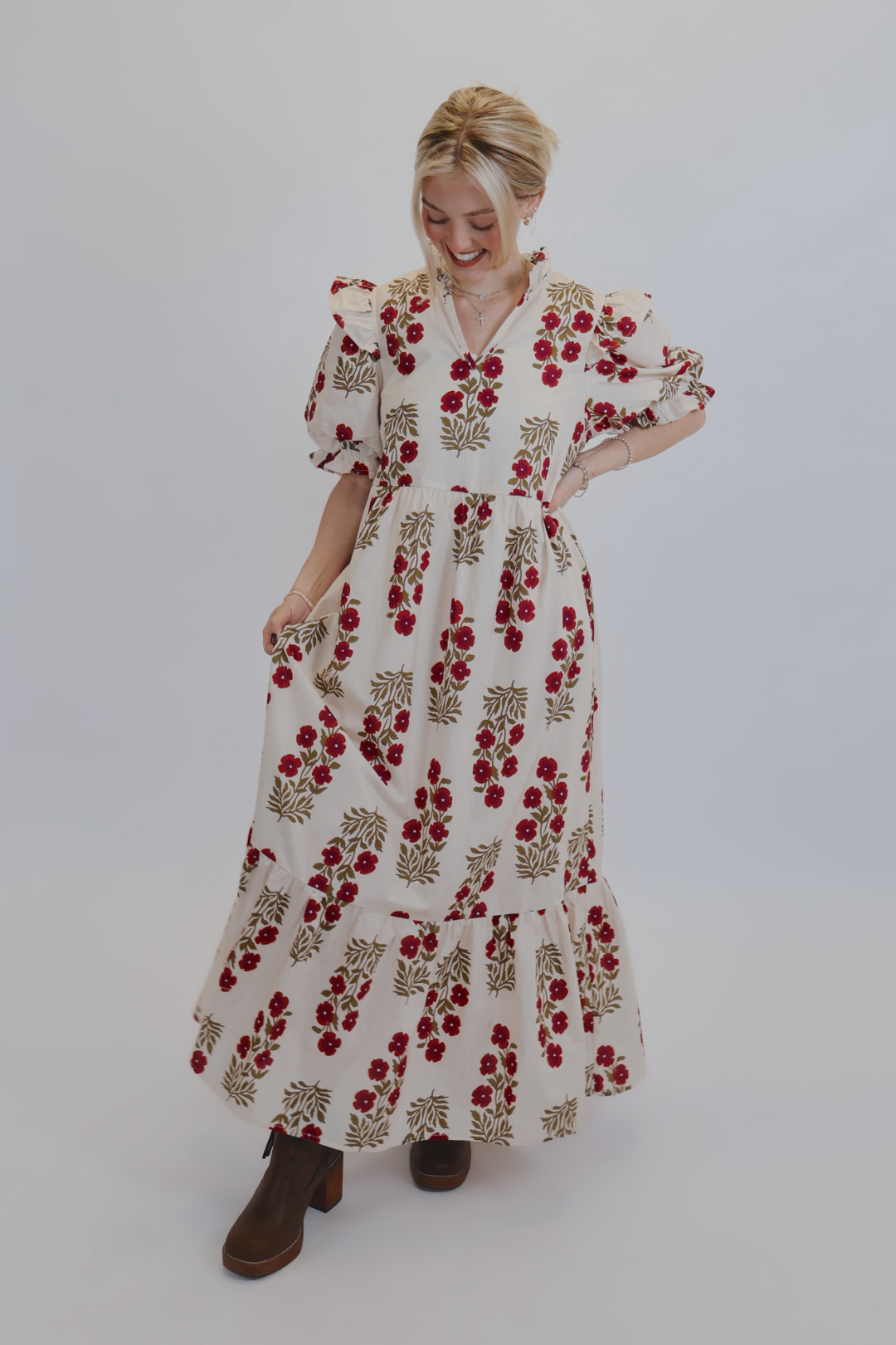 The Garden Muse Midi Dress brings soft romance to every occasion. Crafted from 100% cotton, this floral print beauty features short puff sleeves with elasticized ruffle cuffs, a ruffled split neckline, and charming shoulder ruffle accents for a touch of feminine flair. The tiered ruffle hem and hidden side pockets add comfort and movement, making it perfect for spring strolls or weekend brunch.