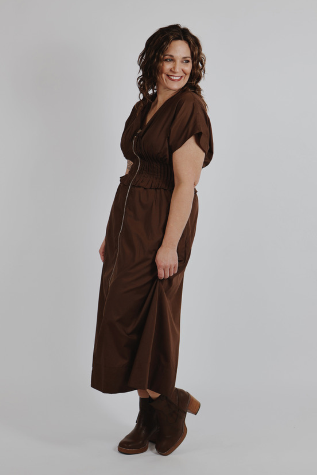 Meet the Harvest Mocha Dress — a timeless midi that blends soft structure with effortless charm. Crafted in a rich mocha hue, this woven dress features short sleeves, a flattering smocked waist with pleated trim, and a front zip closure for a modern touch. The self-tie at the back neck and hidden side pockets add an easy, feminine finish.