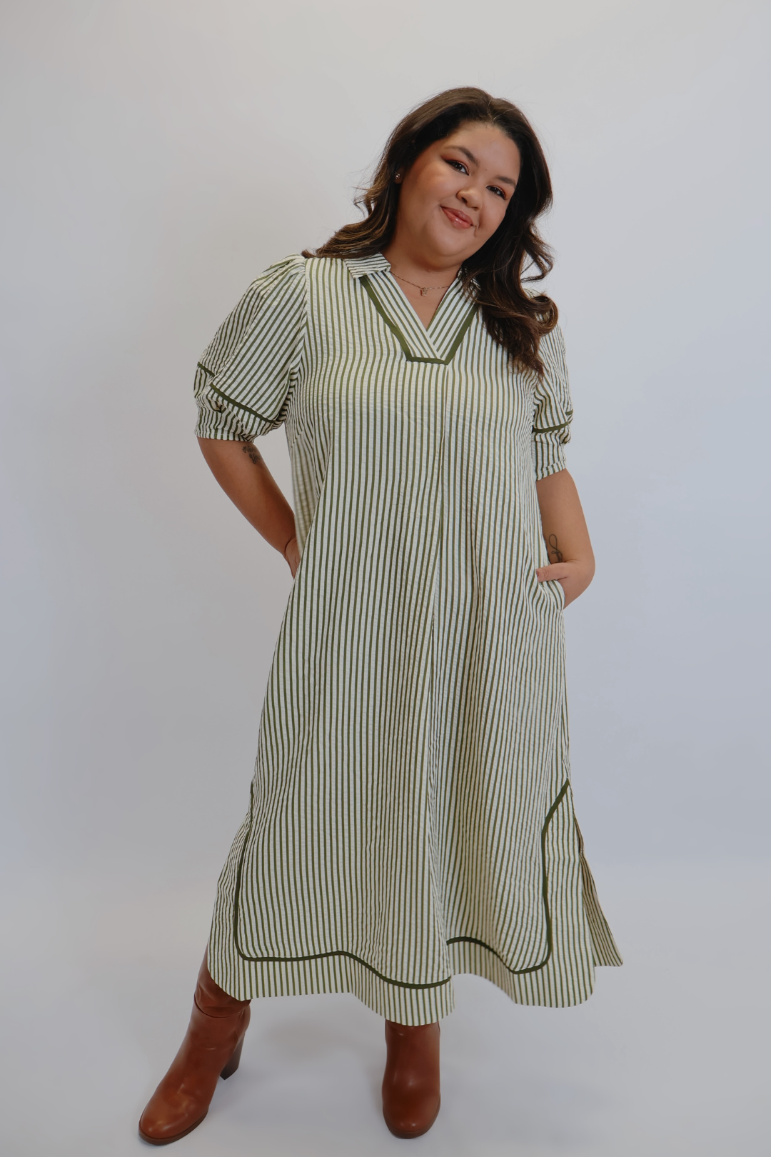 Sophisticated, lightweight, and effortlessly chic—the Olive Lane Striped Midi Dress is your new go-to for polished everyday style. Designed with a flattering V-neckline, soft collar, and contrast trim detailing, this dress brings a modern twist to a timeless striped pattern. The midi length feels elegant yet relaxed, complete with side slits for easy movement and side pockets for functional charm. Puff sleeves add a subtle feminine touch, making this dress perfect for both casual outings and elevated occasions.