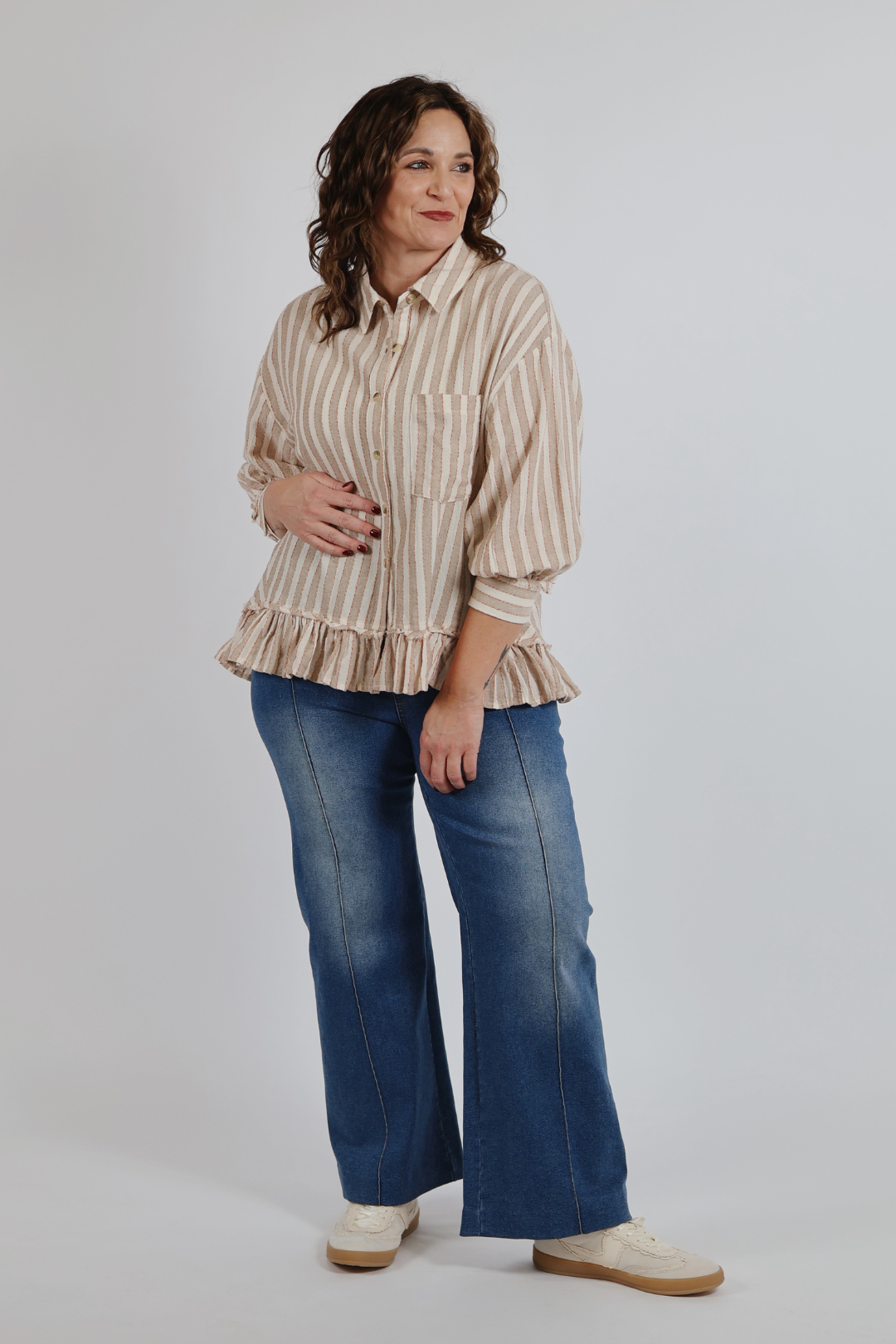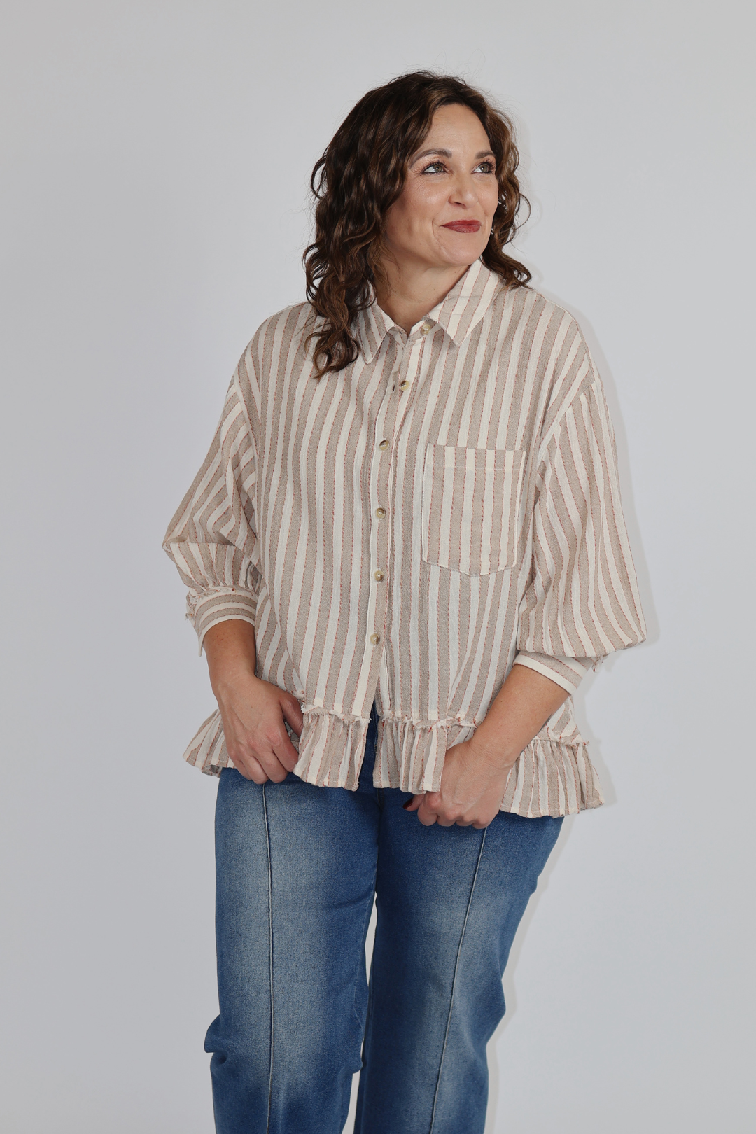Sweet, simple, and full of charm — our Sunday Stroll Striped Ruffle Shirt brings effortless femininity to your everyday look. This lightweight 100% cotton button-down features subtle vertical stripes, a relaxed fit with dropped shoulders, and the prettiest ruffled hem for a touch of playful texture. The collared neckline and front pocket keep it classic, while the soft, airy fabric makes it perfect for layering through the seasons.