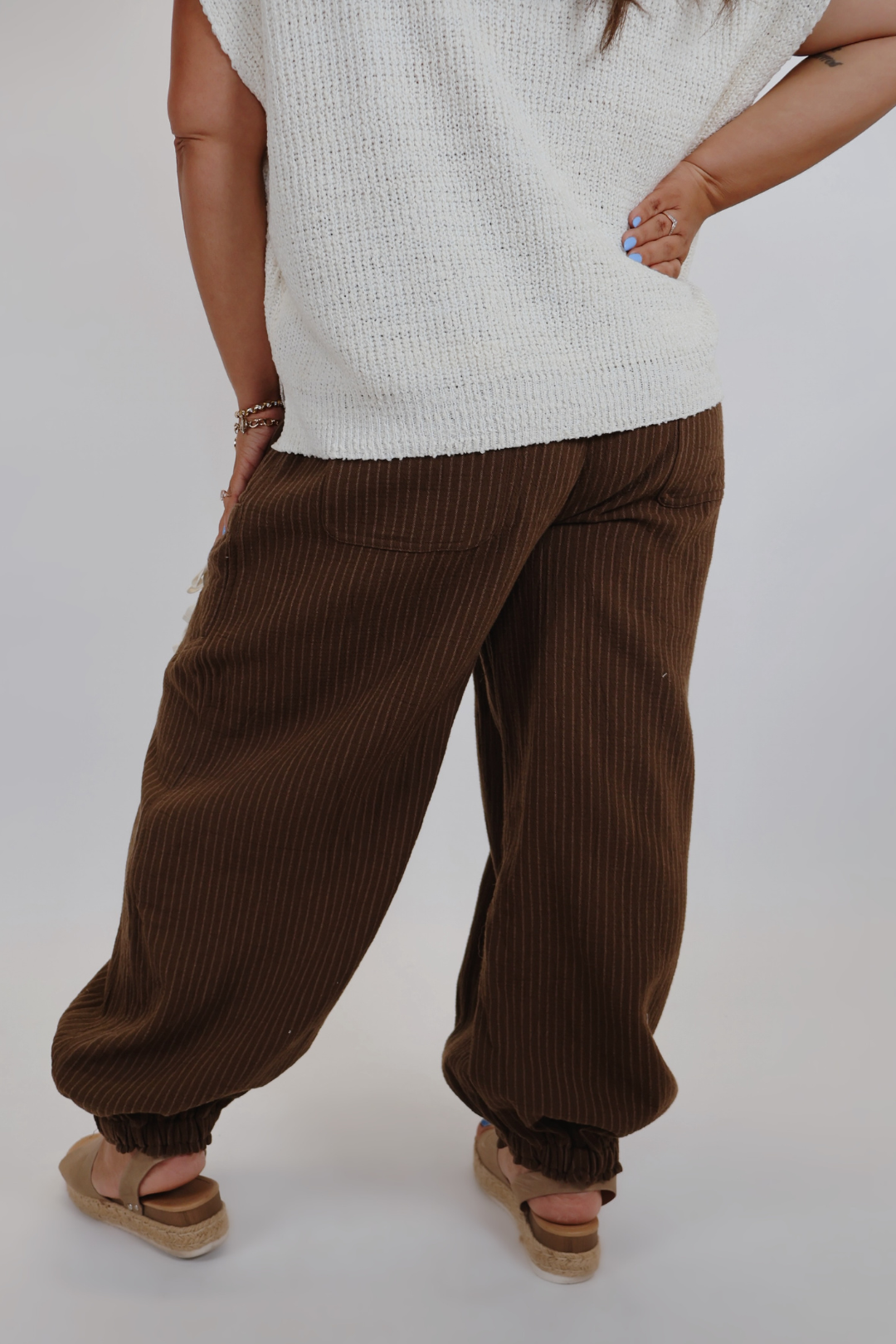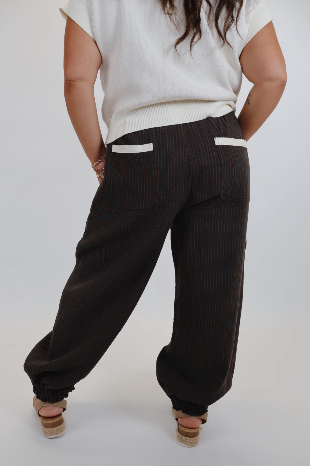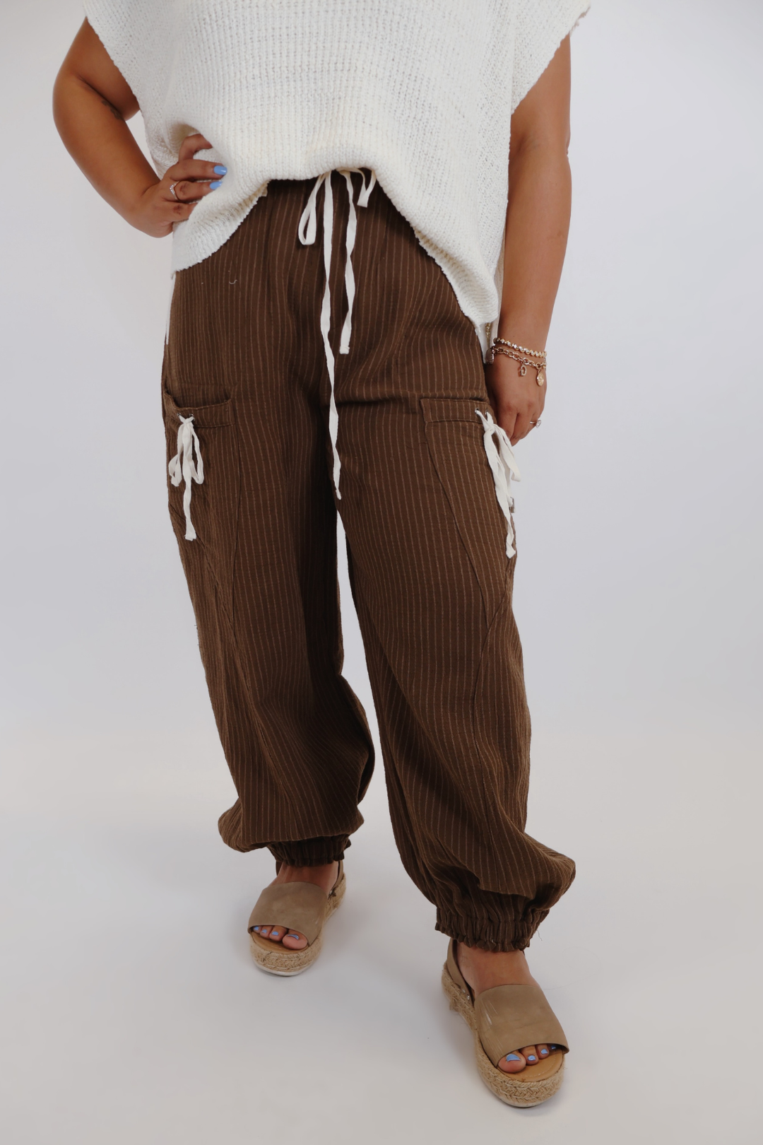 Meet your new go-to for off-duty style: the Urban Stripe Drawstring Joggers. Designed with comfort and versatility in mind, these joggers feature a relaxed silhouette with subtle pinstripes, utility-inspired side pockets, and contrast drawstring details that add a touch of street-chic flair. The elastic waistband and cuffed ankles offer a secure, flattering fit—perfect for everything from errand runs to weekend lounging.